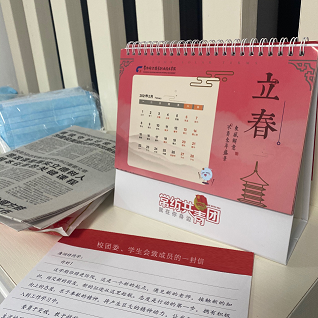 福袋内包含常纺院团委牵头设计的“中国传统节气”原创台历,寒假“政治能力提升”专题学习资料,以及关于每位团委、学生会同学的专属感谢信。